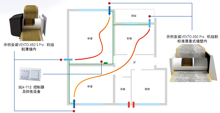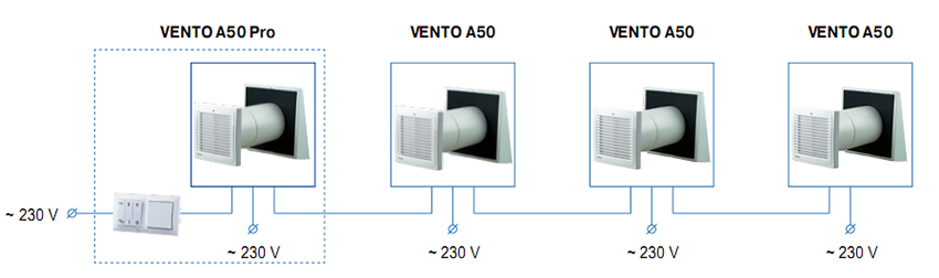 基于4个机组,以安置中央控制式通风系统;连接三个VENTO A50 / A50-1/ A50 S / A50-1 S到一个VENTO A50 Pro / A50-1 Pro / A50 S Pro / A50-1 S Pro,带SEA-T12控制器及供电设备。不需要其他配件。