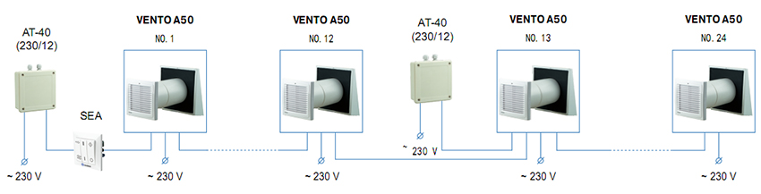 基于4个以上的机组,配置中央控制式通风系统;将四个以上的机组,1个 SEA 三位置及一些12瓦的 AT-12 变压器或40 瓦 AT-40 变压器, 取决于整机能耗,连接至一个 VENTO A50 / A50-1/ A50 S / A50-1 S机组。