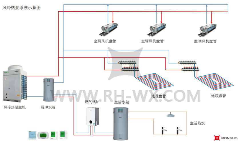 风冷热泵系统以水为冷热传递的介质,这为多能源系统整合提供了便利,系统以风冷热泵为主,以同为水系统的燃气锅炉或太阳能为辅,优劣互补,极大的提升了系统的运行效率和稳定性,是地源热泵系统外,理想的空调、采暖系统。