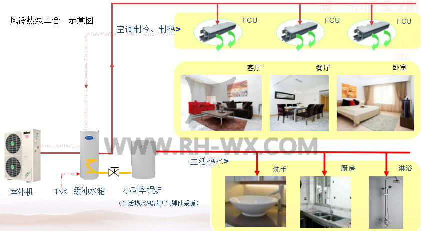 如果我们不想铺地暖那是不是需要一套制热效果好的空调系统呢?那理想的方案就在这里:风冷热泵+燃气锅炉空调采暖系统。